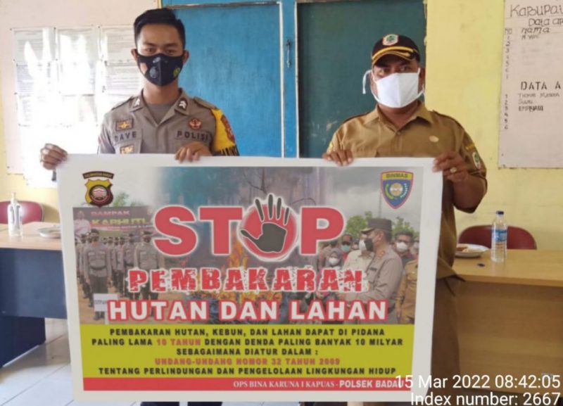 Polsek Badau-Mengantisipasi terjadinya kebakaran hutan, lahan, dan kebun Polsek Badau melalui Bhabinkamtibmas gencar kampanyekan karhutla secara bergilir pada tiap Desa Kecamatan Badau dengan pemasangan himbauan-himbauan dalam bentuk benner, selebaran dan himbauan secara langsung agar dapat di pahami dan diterima oleh masyarakat Desa Kekurak. Selasa (15/3/2022).