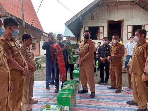 Samosir, Kompasnasional.com | Bupati Samosir Vandiko T. Gultom, S.T menyerahkan langsung bantuan alat-alat pertanian kepada dua Kelompok Tani (poktan) di Desa Siparmahan, Kecamatan Harian, Selasa (18/1/2021).