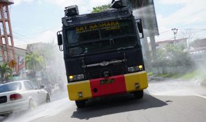 Menggunaan AWC (Armour Water Canon) inventaris Sat Sabhara Polresta Pontianak Kota, Kabag Ops, AKP. Rizal Satria Ferdianto, S.IK., memimpin giat penyemprotan disinfektan di sebagian jalan utama kecamatan Pontianak Barat dan Pontianak Kota.