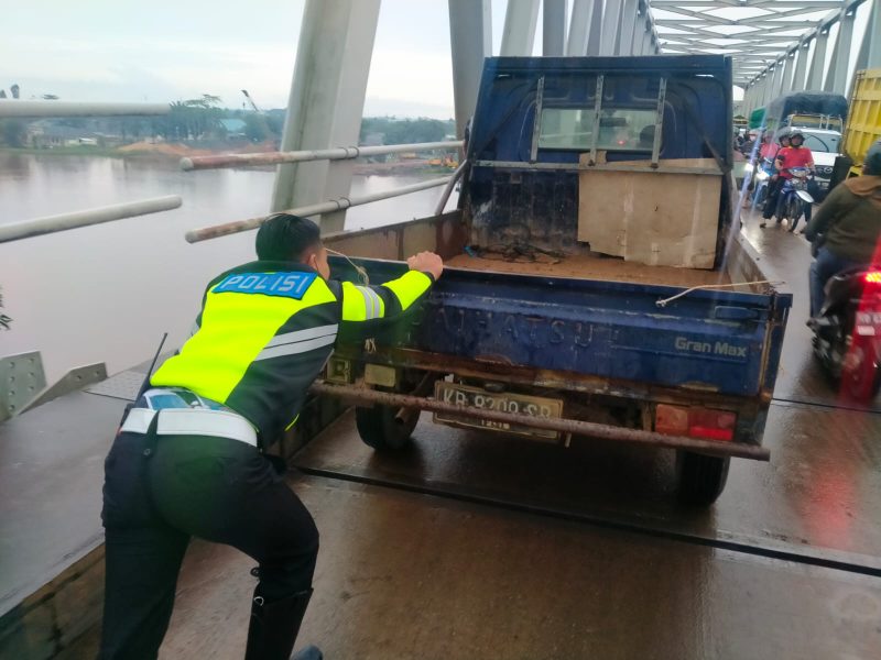 Ada hal yang menarik, pada saat salah satu mobil picup milik masyarakat yang mogok diatas jembatan tol desa kapur, tak ingin terjadi kemacetan semakin parah dengan cekatan dua personil Satlantas Polres Kubu Raya mengurai kemacetan tersebut dengan cara mendorongnya.
