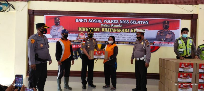 “Kapolres Nias Selatan, mengatakan kegiatan pembagian Sembako ini dilakukan oleh Polres Nias Selatan yakni sebagai salah satu rangkaian dalam kegiatan menyambut peringatan hari Bhayangkara ke-75 tahun, dengan tujuan untuk membantu warga yang kurang mampu di wilayah hukum Polres Nias Selatan”, jelas Kapolres