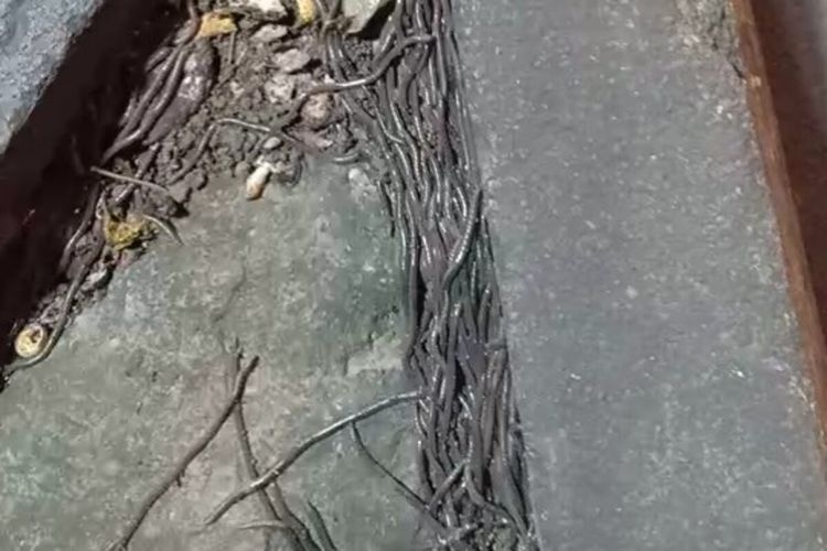 Saking banyaknya, cacing yang keluar dari dalam tanah tersebut menyebar sampai ke jalur pejalan kaki dan jalan raya.