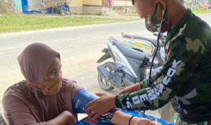 Karya bhakti kali ini juga melaksanakan pengecekan kesehatan dan pengobatan gratis kepada masyarakat, penyuluhan protokol kesehatan dan membagikan masker bagi pengendara bermotor yang melintas.