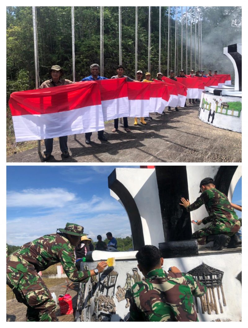 Bengkayang, Kalbar,KOMPAS NASIONAL.Com– Personel Pos Komando Utama (Kout) dan Pos Koki SSK II Jagoi Babang Satgas Pamtas RI-Malaysia Yonif 645/Gty dipimpin langsung WADAN Satgas Pamtas Yonif 645/Gty Kapten Inf Agus Dwi Prabowo beserta 8 (delapan) Orang anggota bersama instansi-instansi terkait yang berada di perbatasan Melaksanakan Karya Bakti dan pengecatan Tugu Garuda dalam rangka menyambut HUT RI Ke-77 Tahun 2022 dan sekaligus penyerahan Sarana Kontak berupa 18 buah Bendera Merah Putih kepada Kepala BPPD Kab. Bengkayang, bertempat di Tugu Garuda Jln. Dwikora Dusun Jagoi Desa Jagoi Babang Kab. Bengkayang KALBAR. Jumat, (29/07/2022)