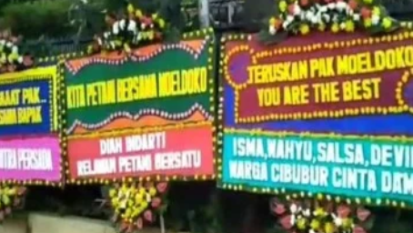 “Maju terus Pak Moeldoko, salah satu putra terbaik bangsa,” bunyi salah satu pesan dalam karangan bunga yang dikirimkan ke rumah Moeldoko. “Kami bersama pak Moeldoko” demikian bunyi pesan lainnya.
