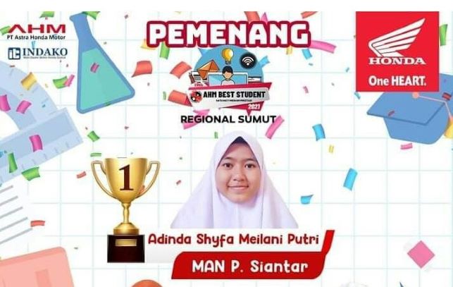 Kompas Nasional l PEMATANGSIANTAR-Prestasi gemilang kembali ditorehkan Siswi Madrasah Aliyah Negeri (MAN) Pematangsiantar, Jalan Singosari, Kecamatan Siantar Barat, Kota Pematangsiantar, Sumatera Utara, dalam ajang Astra Honda Motor (AHM) Best Student 2021 meraih juara satu karya tulis ilmiah tingkat provinsi Sumatera Utara (Sumut), hal tersebut dikatakan Hasanuddin Hasibuan Spd.M.SI selaku kepala sekolah MAN Pematangsiantar saat dijumpai diruang kerjanya Rabu,(25/8/2021) Sekitar pukul 10.30 WIB.