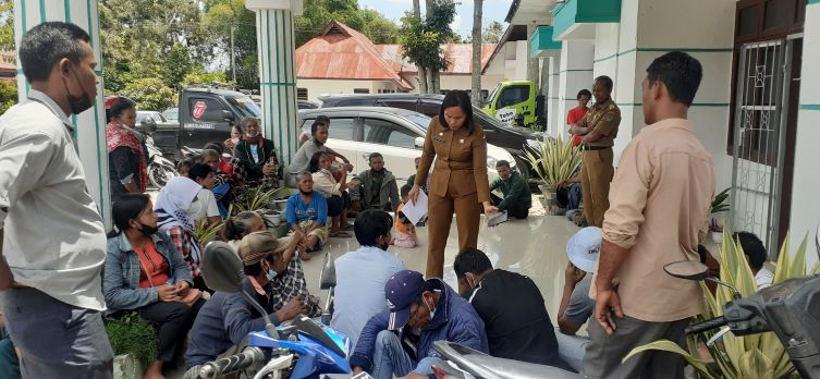 Warga masyarakat yang mengadakan aksi duduk di teras kantor Dinas Lingkungan Hidup Kab.Toba bersama dengan kepala desa Tongatonga I Robinson Marpaung.