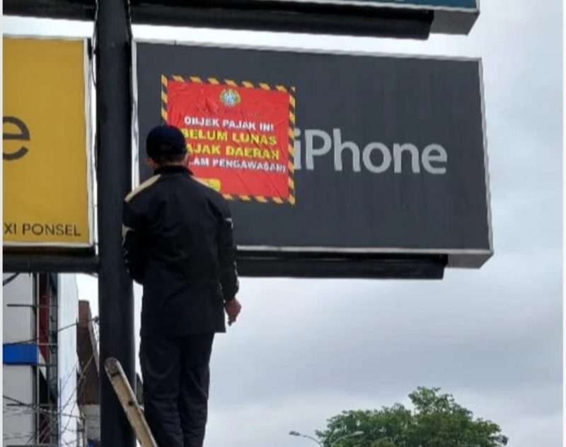 Beberapa reklame yang terdata belum melunasi pajaknya ditempeli stiker berwarna merah dengan tulisan ‘Obyek Pajak Ini Belum Lunas Pajak Daerah (Dalam Pengawasan)’.