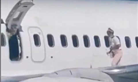 Video yang beredar di media sosial memperlihatkan perempuan itu berjalan santai di sepanjang sayap pesawat sebelum naik kembali ke dalam kabin