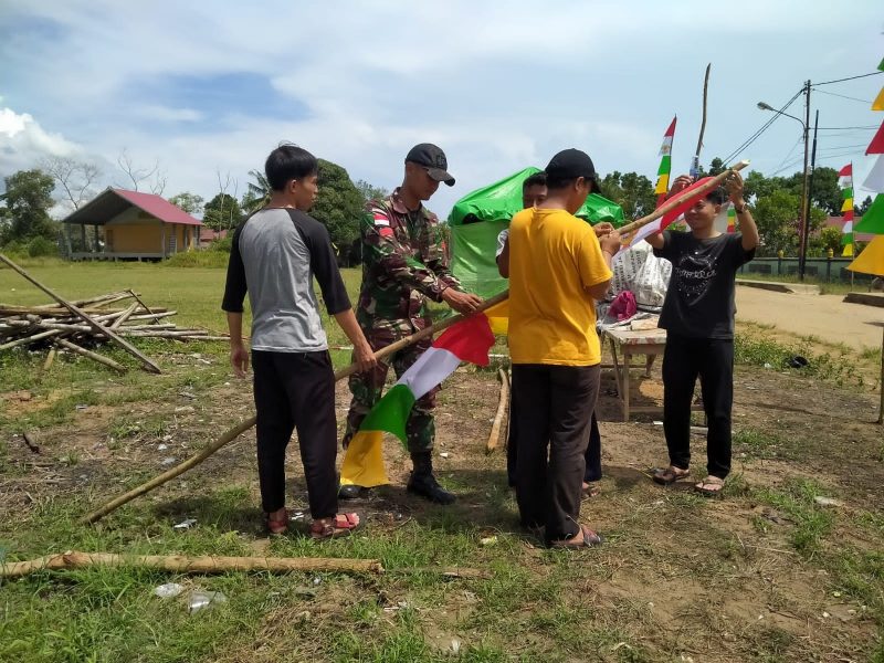 Persiapan HUT RI Ke-77, Satgas Pamtas Yonif 645/Gty Bagikan Dan Pemasangan Umbul-Umbul dan Bendera Merah-Putih Diwilayah Perbatasan RI-Mly