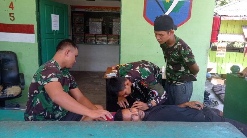 Bengkayang, Kalbar Kalbar,KOMPAS NASIONAL.Com – Takes Pos Kumba semunying satgas pamtas RI-malaysia Yonif 645/Gty membantu warga yang terkena kecelakaan pada saat bekerja di dusun. Pareh Desa. Sinar baru Kec. Jagoi Babang, Kab. Bengkayang. Jumat, (15/07/2022)