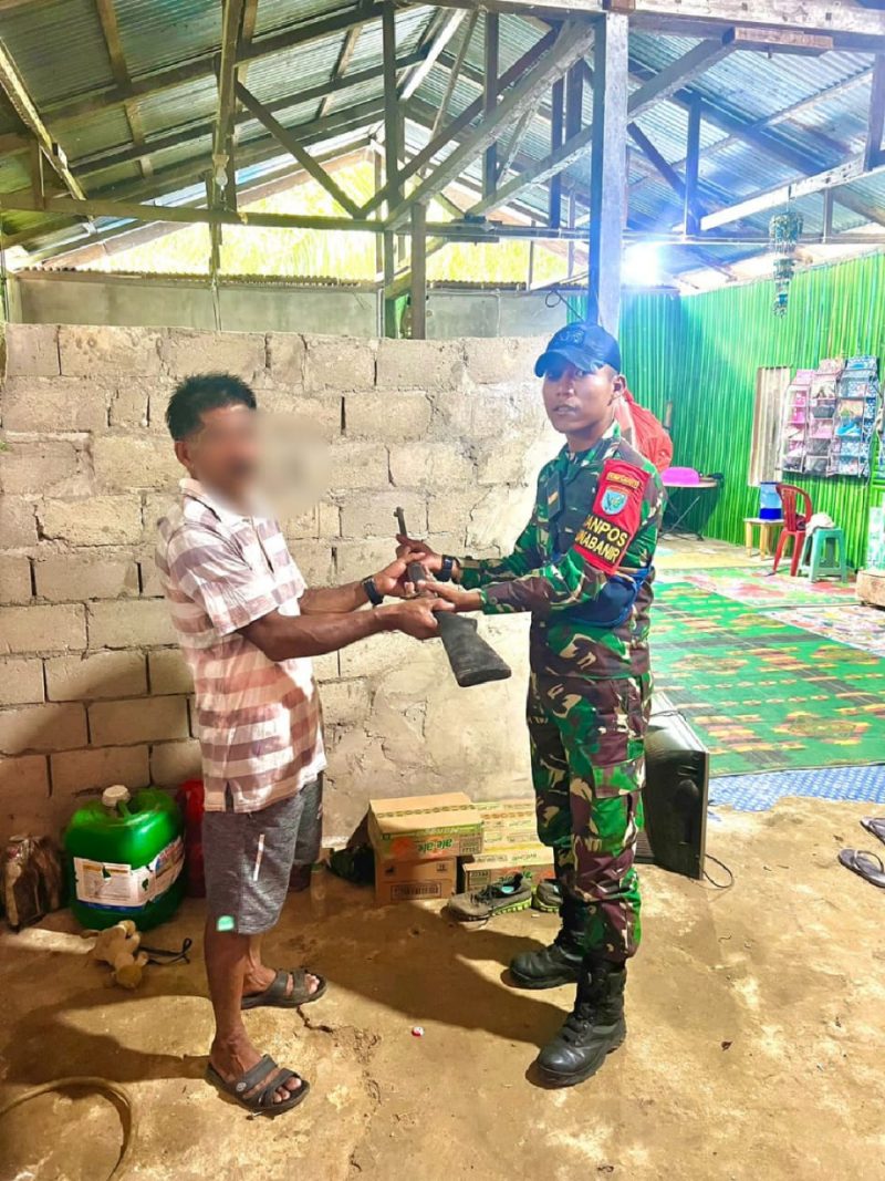 Penyerahan senpi ini bermula ketika kegiatan anjangsana Danpos Guna Banir Letda Inf Rikky Aditya beserta 1 orang anggotanya ke rumah Bpk. KMR, Menurut penjelasan dari Danpos Guna Banir “Ketika sedang berbincang-bincang Danpos Guna Banir meminta ijin kepada Bapak KMR selaku pemilik rumah untuk ke kamar mandi dan tidak sengaja melihat ada 1(satu) pucuk senjata api yang berada di dapur sehingga Danpos Guna Banir memberikan penjelasan tentang bahaya memiliki/menggunakan senjata api sesuai dengan aturan hukum yang berlaku diindonesia Undang-Undang Darurat RI Nomor 12 Tahun 1951”. Ujar Danpos