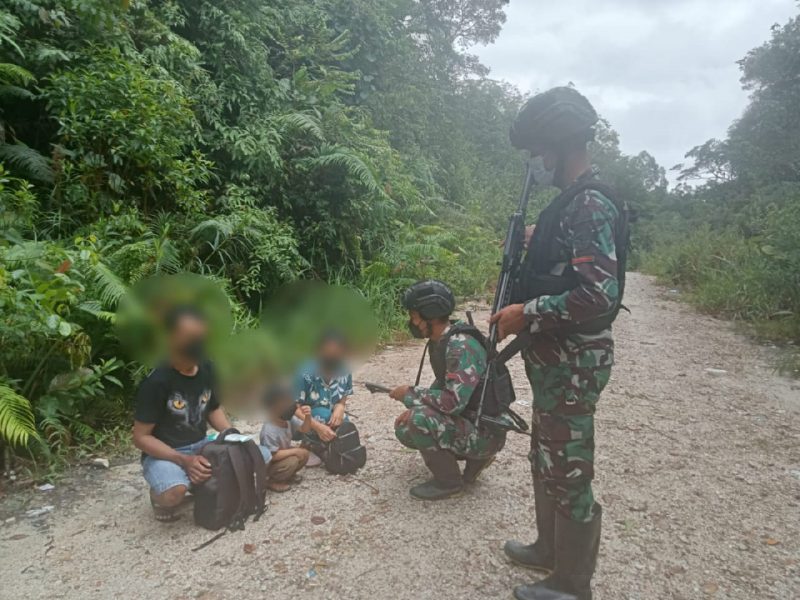 SAMBAS, KALBAR – KOMPAS NASIONAL.Com- Prajurit Pos Koki Sajingan SSK 1 Satgas Pamtas RI-Malaysia Yonif 645/Gty dipimpin Sertu Deri beserta 5 (lima) orang anggota kembali amankan 3 (Tiga) orang WNI yang diduga Pekerja Migran Indonesia (PMI) Non Prosedural yang menggunakan jalan tikus/tidak resmi sektor kanan PLBN Aruk, Desa. Sebunga Kec. Sajingan Besar Kab. Sambas Kalbar.