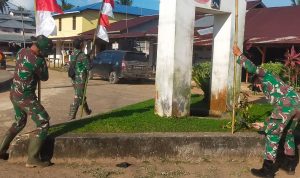 Sambas Kalbar ,Kompasnasional.com. Satgas Pamtas Yonif Mekanis 643/Wns melaksanakan gotong royong di Dermaga Pantai Camar Bulan, Dusun Camar Bulan, Desa Temajuk, Kec. Paloh, Kab. Sambas.