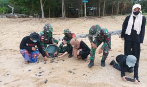 Sambas-Kalbar. Kompas Nasional.com. Dalam rangkaian memeriahkan Hari Sumpah Pemuda ke-93, Satgas Pamtas Yonif Mekanis 643/Wns bersama kelompok masyarakat wahana bahari dan kelompok pemuda jaga iklim menggelar kegiatan pelepasan 300 ekor tukik (Anak Penyu) ke laut lepas dan karya bhakti membersihkan pantai, bertempat di pantai pos monitoring penyu Kecamatan.Paloh, Kabupaten . Sambas.Jum’at (29/10/2021).