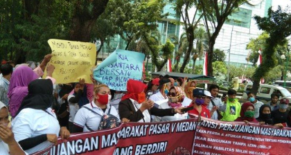 Kompasnasional | Ratusan masyarakat yang tergabung dalam Aliansi Perjuangan Masyarakat Pasar V Kelurahan Lalang kecamatan Medan Sunggal, melakukan aksi demonstrasi di Gedung DPRD Medan, Selasa (1/9/2020).