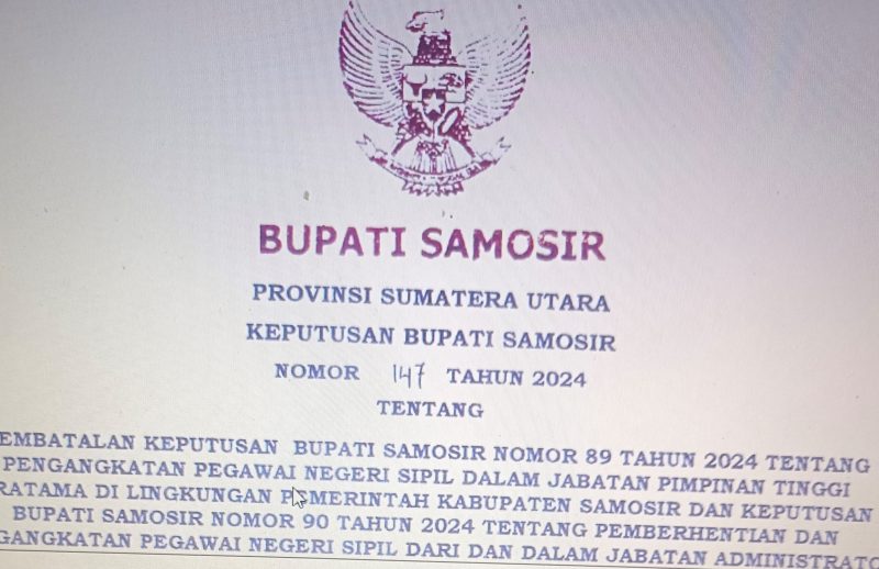 JEJAK NASIONAL, SAMOSIR – Surat Keputusan (SK) Bupati Samosir Nomor 147 tentang Pembatalan SK Bupati Samosir Nomor 90 Tahun 2024 tentang pemberhentian dan pengangkatan pegawai negeri sipil dari dan dalam jabatan administrator dan pengawas dilingkungan Pemerintah Kabupaten Samosir disinyalir tidak konsisten.