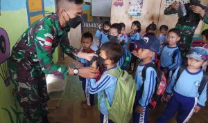 Sambas, Kalbar – Kompas Nasional.com Untuk menanamkan disiplin protkes dan kepribadian yang baik, Satgas Pamtas Yonif Mekanis 643/Wns melakukan pembagian masker dan mengajar di PAUD Generasi Bintang Aruk, Desa Sebunga, Kec. Sajingan Besar, Kab Sambas.