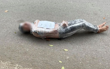 Dalam unggahan yang viral di media sosial, nampak lelaki itu diikat di pohon dalam keadaan memakai helm dan tanda bertuliskan “Aku benci membayar tato”.