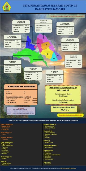 Update Covid-19 di Kabupaten Samosir 27 Agustus 2021, Tambah 13 Kasus, Sembuh 99 Kasus, Kasus Aktif 126