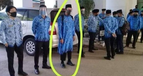 Rata-rata para ASN dalam foto itu memakai peci hitam. Hanya ada satu pria yang tidak memakai peci.